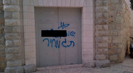 Sprayed Slogans on the Monastery entrance; Photo by: Israeli Police Spokesman