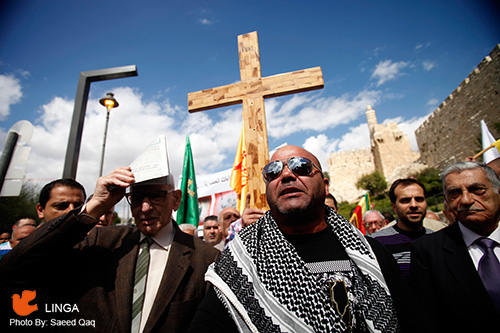 A guy carrying the cross up front of the demonstration, photo by Saeed Alqaq