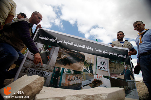 A banner that has photos of the attacks on the Christian Holy Sites, photo by Saeed Alqaq