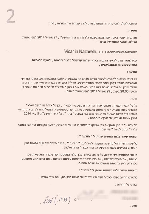 The letter mentioned that the Bishop Boulos Marcuzzo has to pass it on to all the Christian Priests in Israel but not to the Anglican and Protestant churches. It also included that the clergy men including the Patriarch himself and also the other Christians citizens of Israel , who are members of the Christian denominations (except for the Protestant and Anglican churches) have to leave the country by the Fifth of May 2014 before sunset, or else 100 people from the Christians who are members of the targeted churches will be killed for every hour of delay.
