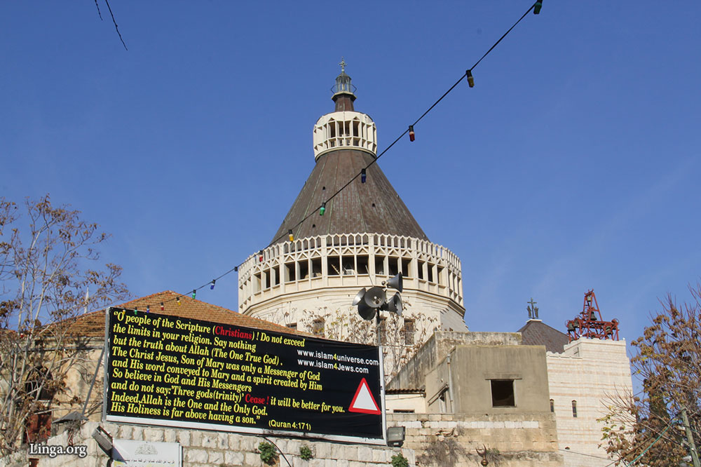 Souvenir shops, clothing stores, famous sites, Shwarma restaurants, falaful stands and Middle Eastern charm flowing through the streets of the city are among the basic elements of what one will find in the rather run-down town. And while there are Mosques, Catholic, and Greek Orthodox churches galore in this world famous Biblical place, there is one thing that most people not of the Muslim faith would anticipate to see here. Strategically situated in plain sight smack dab in front of the well-known Catholic Church of the Annunciation, is a sign put up by the Islamic movement of the area, which gives a rather ominous warning to Christians specifically. It reads,