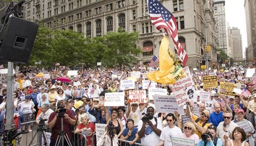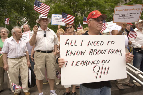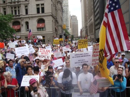 Thousands of protesters gathered around the corner of Liberty and Church Streets on Sunday to voice their opposition to a proposed “mega mosque” near New York City’s Ground Zero.